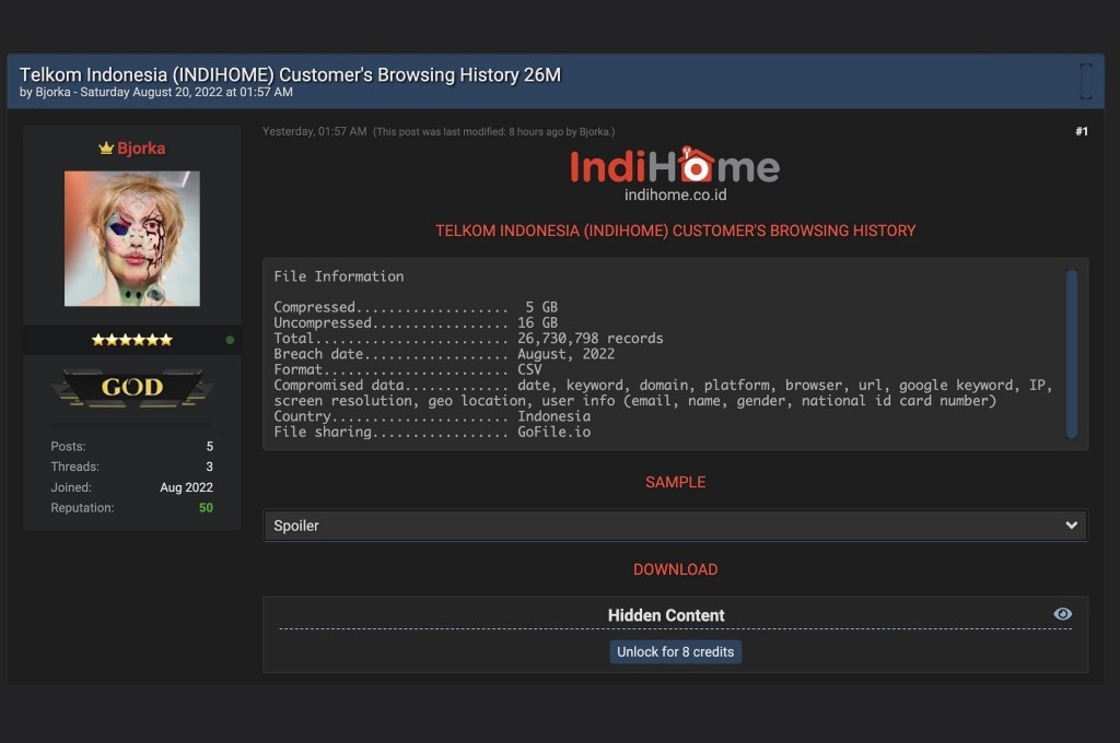 Kini di forum internet yang sama yaitu Breach Forum di alamat breach.to muncul laporan bahwa data pelanggan internet fiber Indihome milik Telkom juga bocor. Data yang bocor tersebut dijual oleh akun dengan nama Bjorkas.