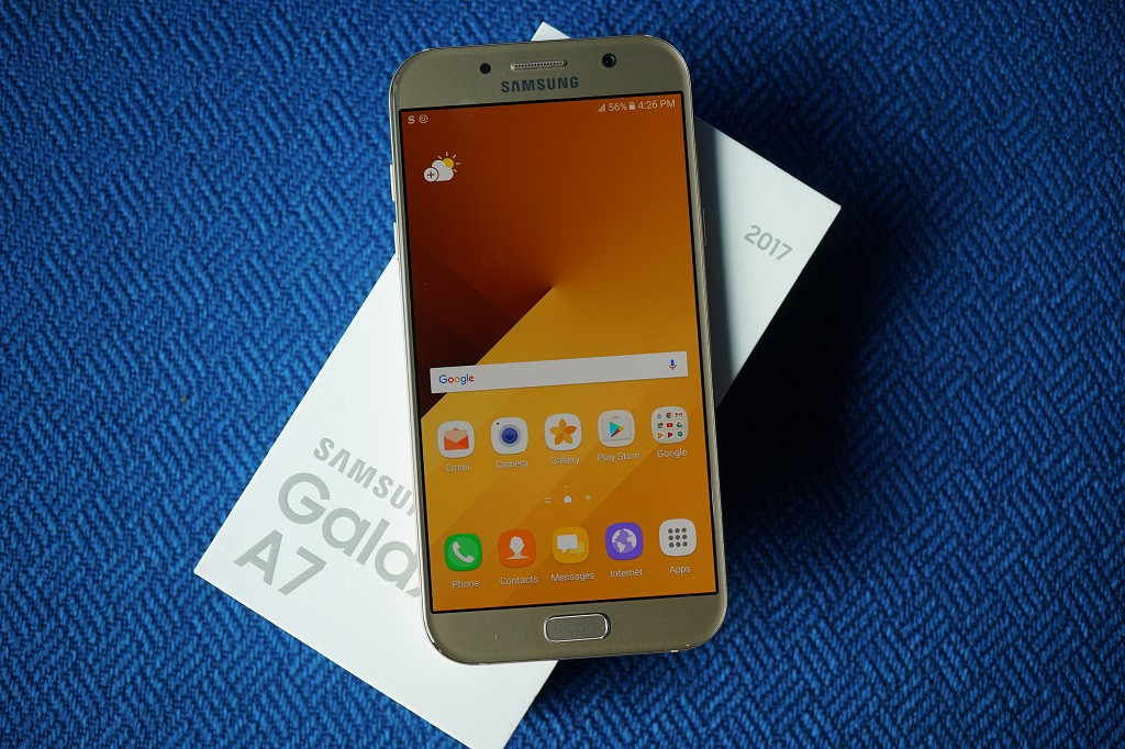 Kini, Metrotvnews.com mendapatkan kesempatan untuk menjajal Galaxy A7, versi paling premium dari jajaran Galaxy A. Kotak smartphone kelas menengah Samsung ini terlihat sederhana. Ia berbentuk persegi panjang dengan warna putih dan tulisan "Samsung Galaxy A7" dalam warna abu-abu di sebelah kiri bawah juga tulisan "2017" di kanan atas dalam warna yang sama.