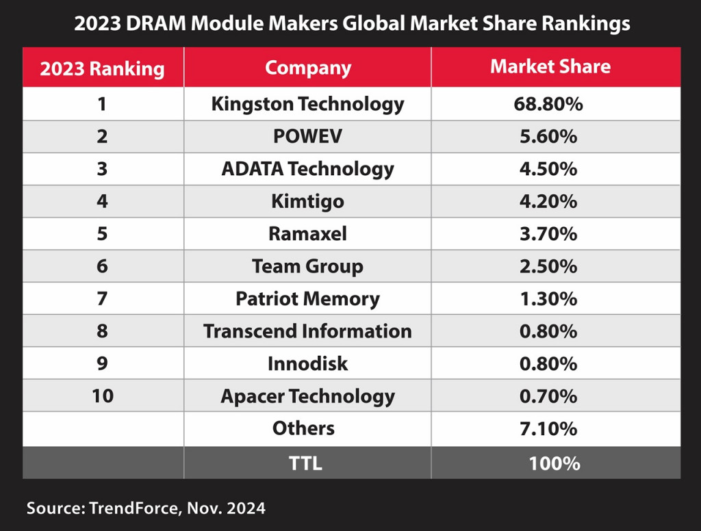 Kingston mempertahankan posisi No. 1 dengan estimasi pangsa pasar sebesar 68,8%. TrendForce menyatakan bahwa penjualan modul DRAM pada tahun 2023 mengalami penurunan 28% secara tahunan di seluruh industri. Meskipun pendapatan Kingston sedikit menurun, perusahaan ini tetap mempertahankan posisinya sebagai pemimpin global selama 21 tahun berturut-turut.