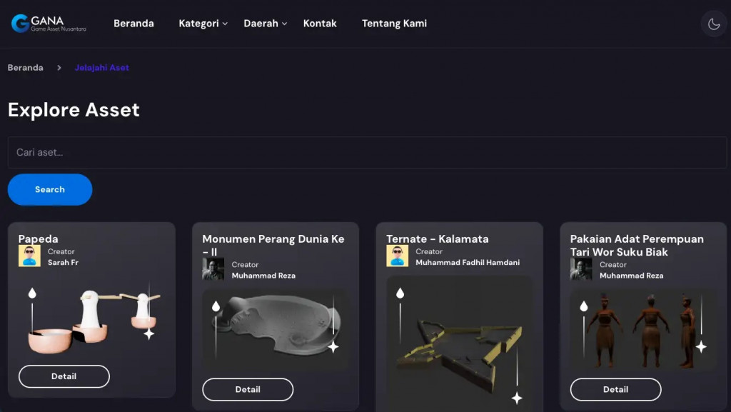 Game Asset Nusantara (GANA) adalah platform digital yang mengumpulkan, mengelola, dan mendistribusikan aset game berbasis budaya Indonesia. GANA dikembangkan untuk mendukung para kreator, pengembang game, hingga pelaku industri kreatif tanah air dalam menghadirkan konten lokal dan mengangkat kebudayaan Indonesia.