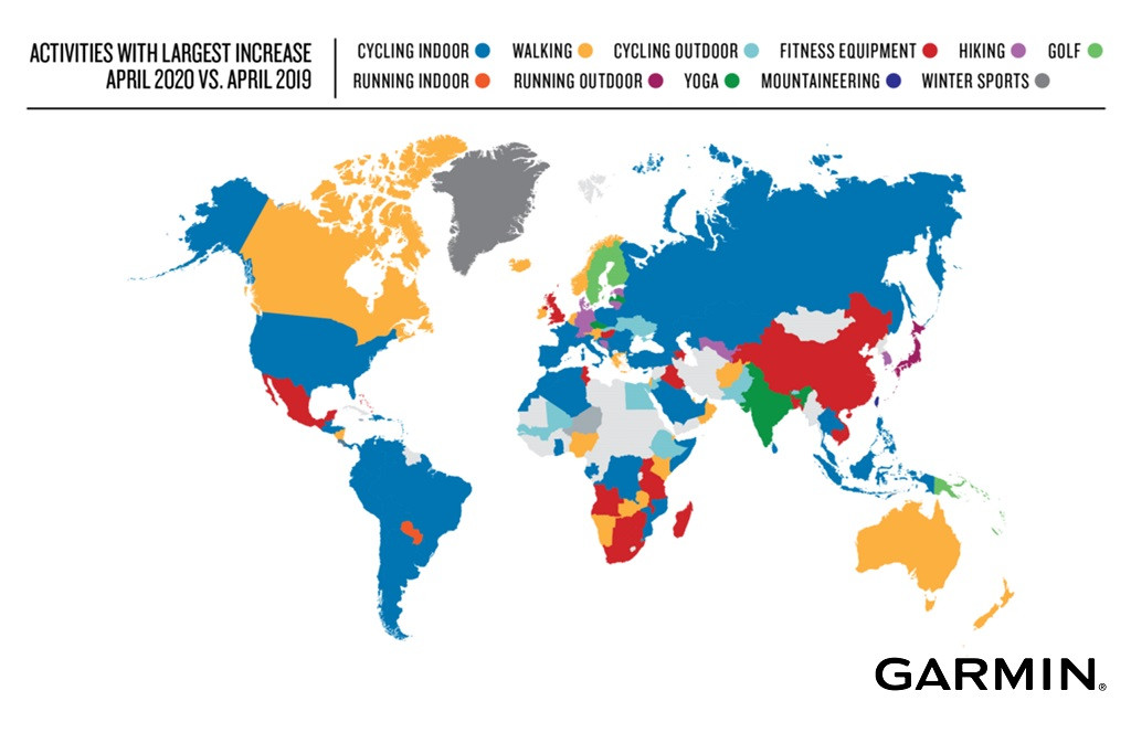 Penurunan pada jumlah langkah atau pergerakan secara general jelas terjadi. Namun, saat diamati lebih dalam, data pengguna yang hanya berfokus pada kegiatan olahraga yang tercatat di perangkat Garmin justru memperlihatkan hasil sebaliknya. Terjadi peningkatan jumlah langkah sebesar 24 persen di seluruh dunia.
