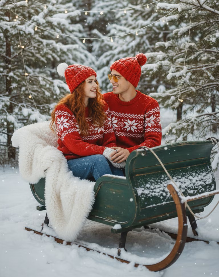 - Buatkan mengenakan sweater yang serasi dan latar kereta luncur, hutan bersalju dengan lampu peri, energi musim dingin yang penuh sukacita dan magis.