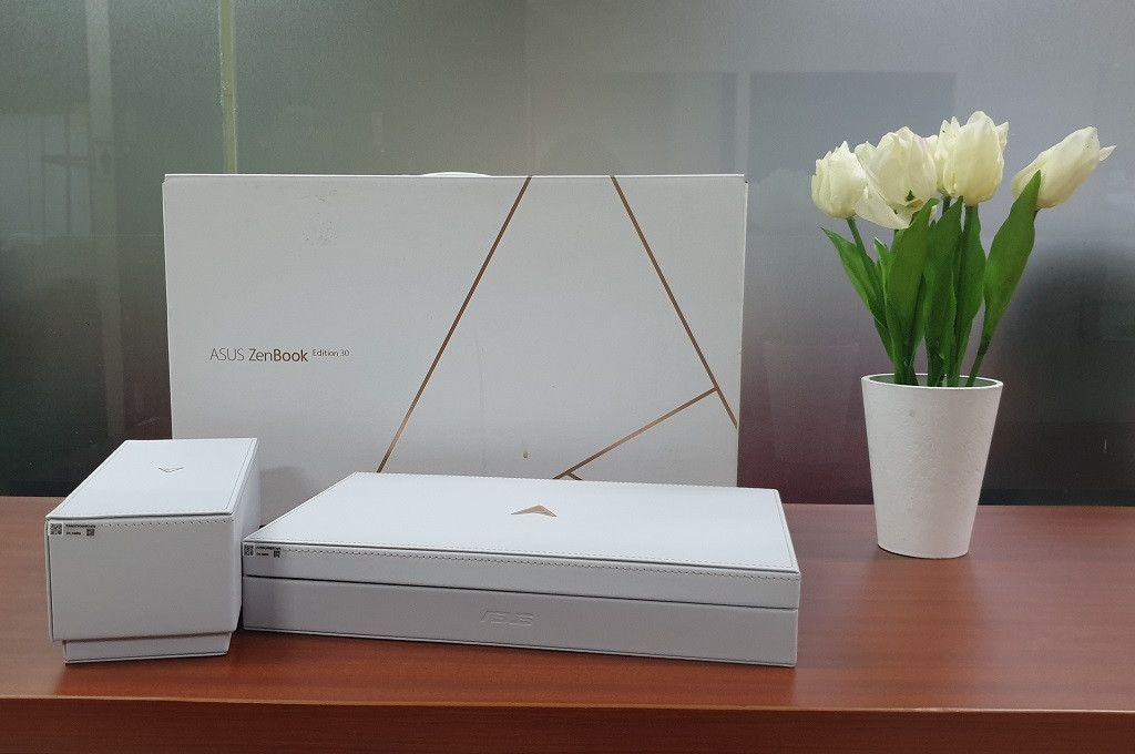 Berbeda dari kemasan penjualan laptop pada umumnya, Asus ZenBook Edition 30 tersimpan dalam kotak cantik berbalut bahan serupa bagian atas laptop dalam warna lebih cenderung abu-abu, dengan logo khusus Asus berwarna keemasan di tengah bagian penutup dan bagian dalam berbahan serupa velvet dengan warna abu-abu lebih gelap.