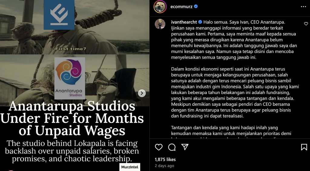 Jawaban Ivan Chen bisa ditemukan pada unggahan akun Instagram @ecommurz yang membeberkan informasi bahwa sejumlah karyawan Anantarupa Studios belum menerima bayaran lima bulan gaji dan THR.