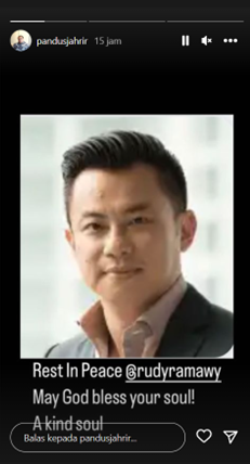 Melalui Instagram story Komisaris Bursa Efek Indonesia (BEI) Pandu Sjahrir mengunggah foto Rudy Ramawy dengan tulisan “Rest In Peace @rudyramawy May God Bless your soul! A kind soul,” tulis Pandu
