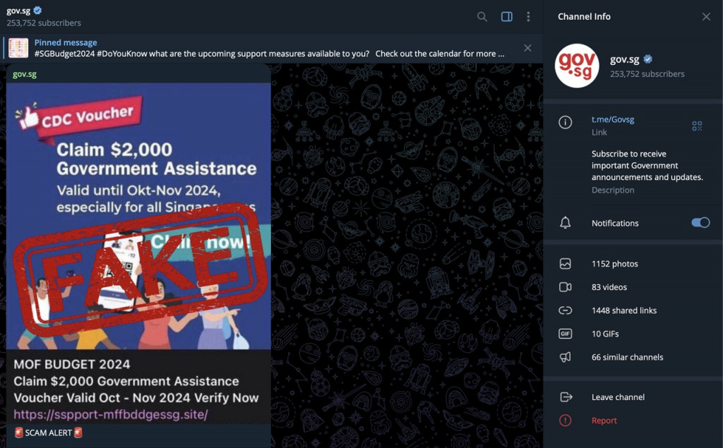 Pekan lalu, pemerintah Singapura mengeluarkan peringatan penipuan di saluran Telegram resmi mereka tentang tautan voucher CDC palsu yang beredar di platform. Mereka mendesak warga untuk "Harap tetap waspada, lindungi diri Anda dari penipuan, dan cari informasi dari saluran resmi terverifikasi."