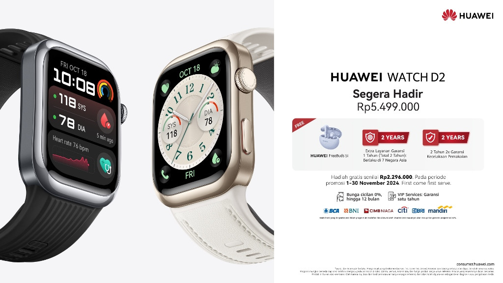 Huawei juga memberikan sejumlah benefit menarik kepada para pelanggan untuk setiap pembelian HUAWEI WATCH D2. Pelanggan akan mendapatkan total benefit senilai Rp2.296.000 berupa GRATIS HUAWEI FreeBuds 5i, total VIP Service garansi 2 tahun, termasuk 1 tahun ekstra layanan garansi yang berlaku di tujuh negara asia, dan 2 tahun garansi kecelakaan pemakaian selama sesi promosi yang berlangsung mulai 1 hingga 30 November 2024.