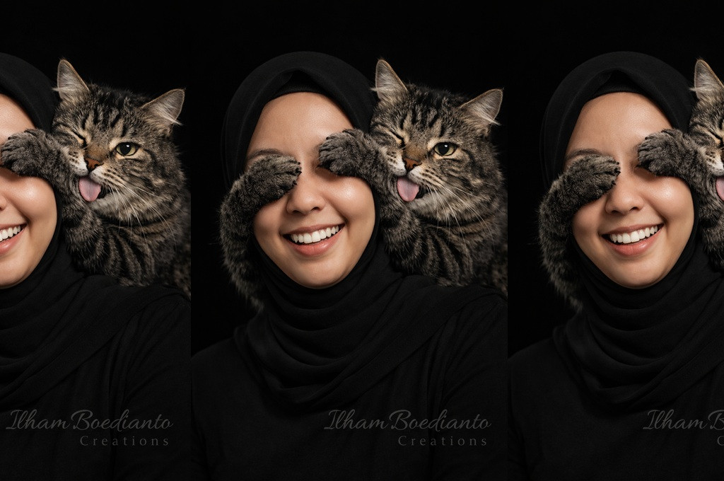 Using the uploaded images, the faces are 100% identical. This high-contrast close-up studio portrait captures a playful moment between a man and a bushy tabby cat on a deep black background. The man, with bright skin and a sincere smile, wore a simple black shirt that fit perfectly on his body, revealing his muscular shoulders and arms. His eyes were one of playfully covered by the claws of a gray and black, hairy tabby cat perched on his shoulder. The cat's face was exaggerated, with one eye narrowing as if blinking, its tongue sticking out with an expression of pure delinquency. The lighting is bright, with a strong main light illuminating the man's face and providing a slight glare, while the softer fill light highlights the cat's fur and playful expression. The overall color palette is dominated by the background's deep black, which contrasts with the bright male skin tone and the gray and brown hues of the cat's fur. The atmosphere was cheerful, unburdened, and full of. Add the semi-transparent watermark text "IlhamBoedianto Creations" in the lower right corner. The Latin font is elegant, smooth, and soft, with an opacity of about 30%, so it doesn't interfere. Aspect ratio of 9:16.Prompt dari akun TikTok ilham_boedianto tersebut di atas dirancang untuk menghasilkan foto bergaya studio dengan kontras tinggi dan latar belakang hitam pekat. Subjek utama akan terlihat lebih menonjol berkat pencahayaan terarah, sementara detail seperti ekspresi wajah dan tekstur objek, dalam hal ini kucing, menjadi lebih hidup.