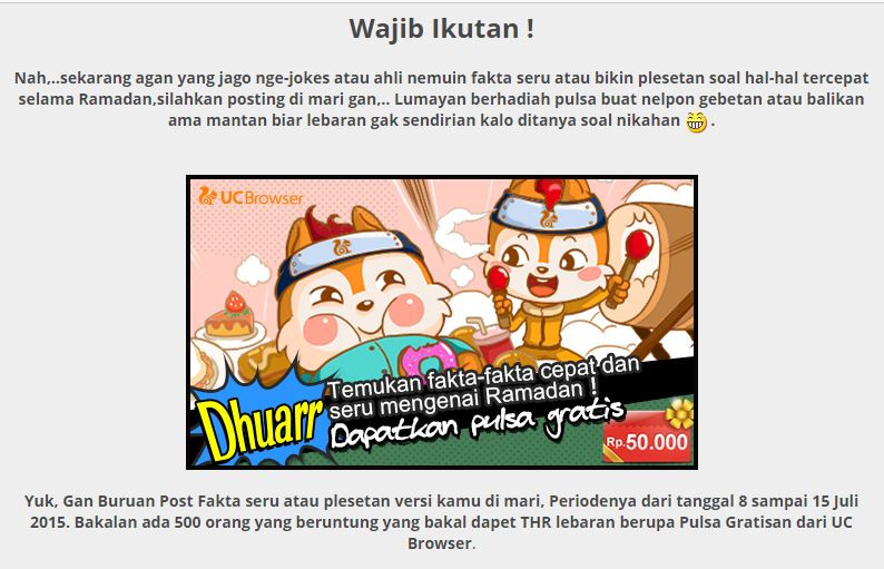 Kompetisi ini dimulai pada tanggal 8 Juli lalu dan akan berakhir di tanggal 15 Juli mendatang. UC Browser akan memilih 500 orang yang beruntung untuk mendapatkan hadiah berupa pulsa gratis.