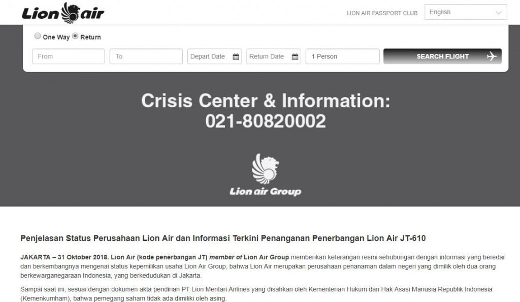 Banner utama di bagian atas diganti dengan informasi nomor kontak crisis center yang dibuka oleh Lion Air. Sementara di bagian tengah mereka mengunggah pernyataan resmi terkait kasus kecelakaan yang menimpa dalam dua bahasa, Bahasa Indonesia dan Bahasa Inggris.
