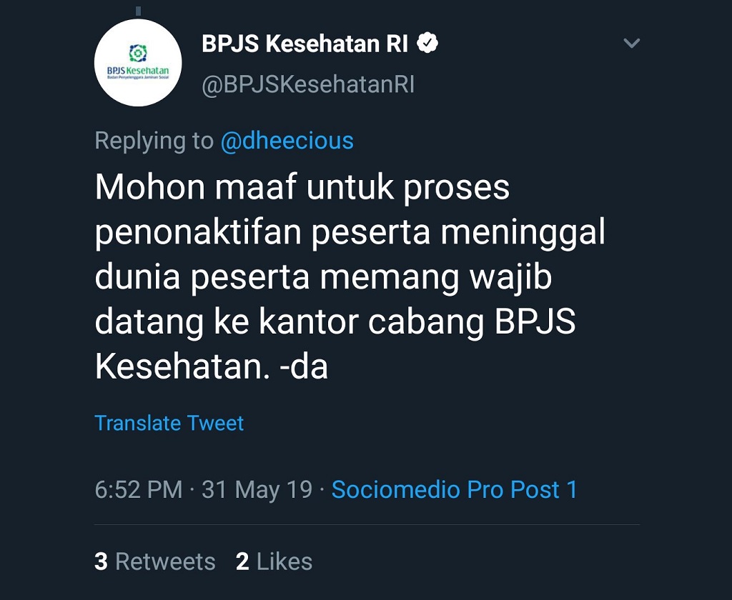 Akun @dheecious mengeluhkan proses penonaktfian keanggotaan BPJS anggota keluarga yang meninggal cukup rumit untuk bisa diselesaikan dengan cepat. Sayangnya, admin akun Twitter BPJS Kesehatan tampaknya kurang seksama membaca pertanyaan sehingga memberikan jawaban yang kurang tepat.