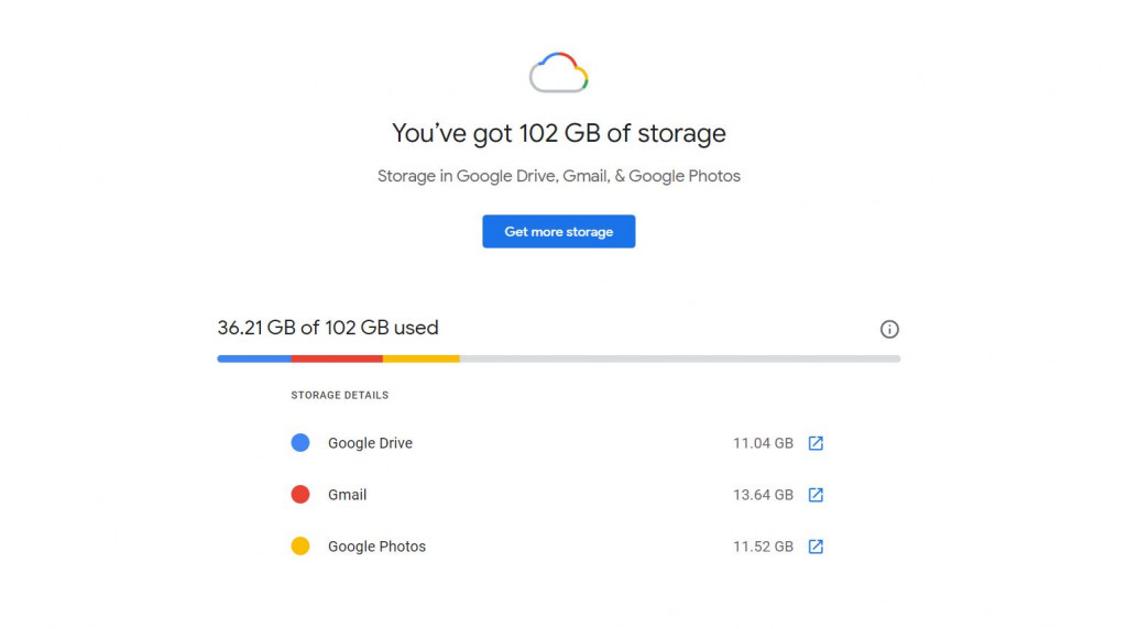 Warna biru untuk pemakaian di aplikasi Google Drive, merah untuk Gmail, dan kuning untuk Google Photos. Di sini juga tersedia pilihan untuk menambahkan kapasitas Google Cloud dengan cara membayar langganan.