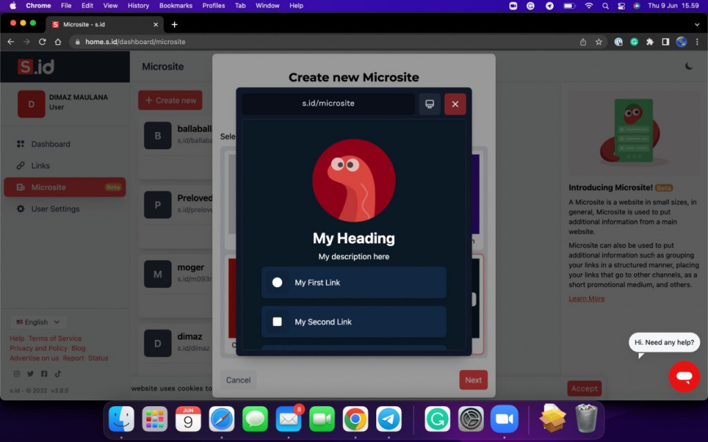 Untuk memulai membuat microsite, masuk ke akun kamu, lalu dari menu di samping, klik microsite dan klik create new. Pilih tema terlebih dahulu, lalu isi nama dan url yang paling cocok menggambarkan akun microsite mu.