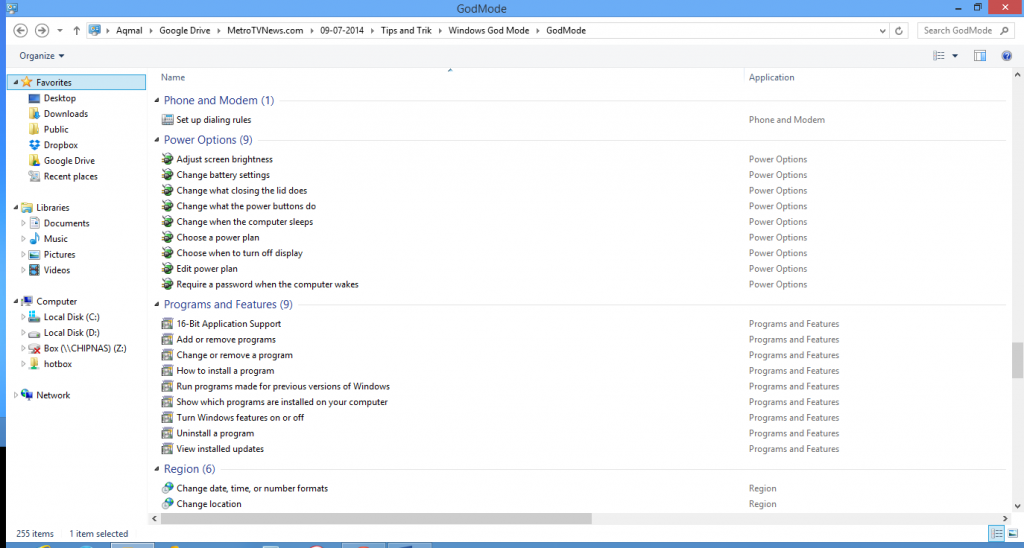 GodMode.{ED7BA470-8E54-465E-825C-99712043E01C}". Setelah itu, Anda dapat melihat seluruh konfigurasi pada Windows dengan membuka folder tersebut.