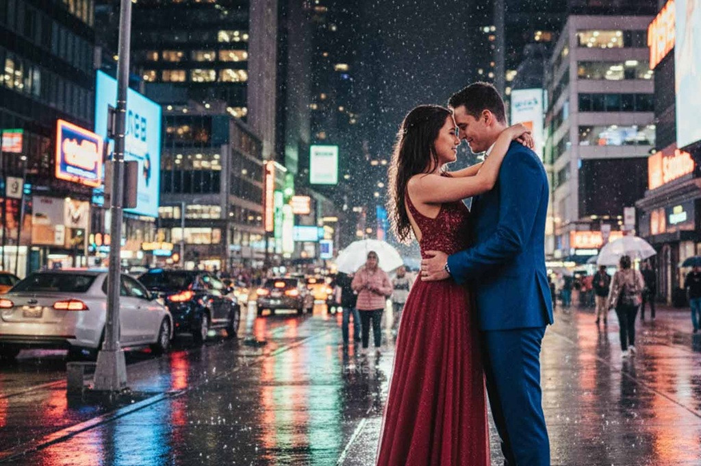 "Ubah foto ini menjadi potret pasangan di jalanan kota yang basah saat malam hari, bergaya Neon Noir yang sinematik. Pasangan saling berpelukan dengan latar belakang lampu neon biru dan pink yang terang. Tambahkan refleksi warna-warni pada genangan air di trotoar dan sedikit film grain."4. Prompt Cinematic Outdoor