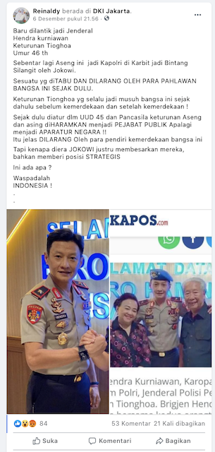 Adalah akun facebook Reinaldy yang mengunggah foto tangkapan layar tersebut, 6 Desember 2020. Akun ini menyesalkan di rezim Presiden Joko Widodo (Jokowi) terdapat aparatur negara atau polisi keturunan Tiongkok atau Tionghoa.