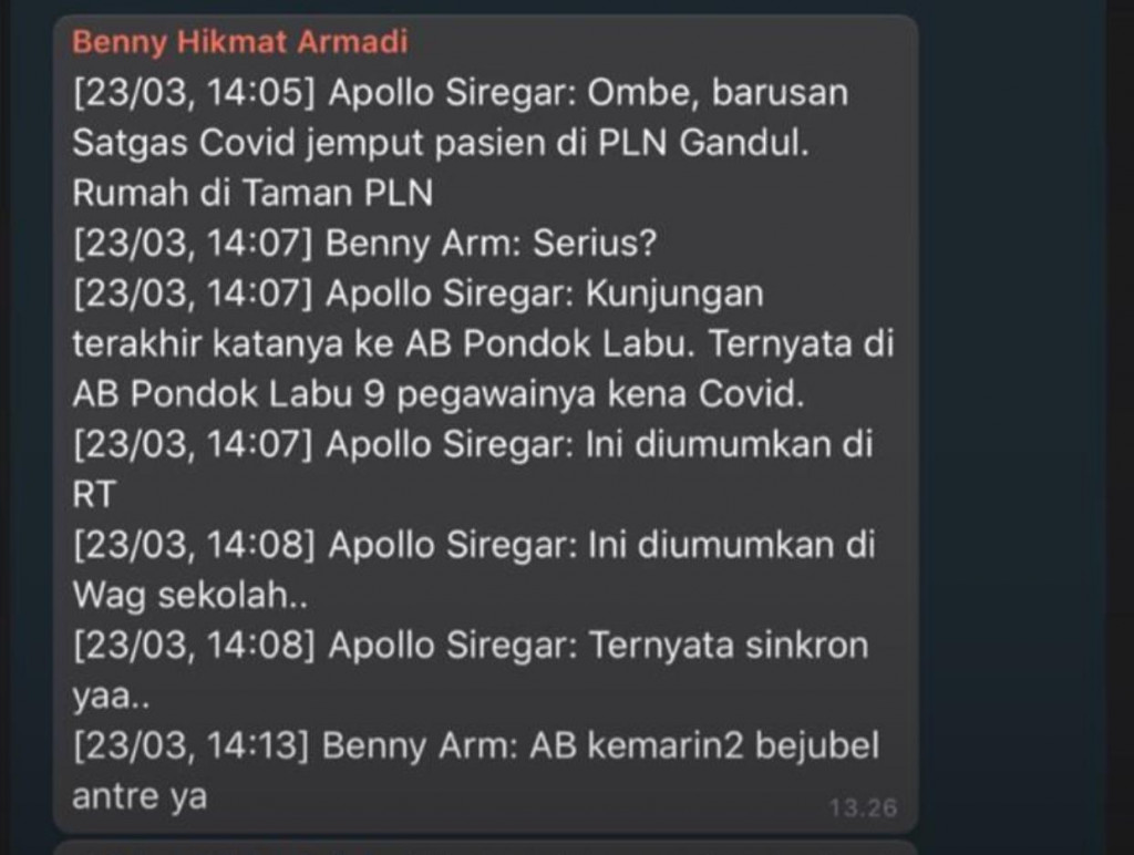 Disebutkan dalam screenshot percakapan WA itu, tim Satgas covid-19 menjemput seorang pasien positif Korona. Disebutkan, aktivitas terakhir pasien tersebut berada di pasar swalayan Aneka Buana (AB) Supermarket Pondok Labu, Jakarta Selatan.