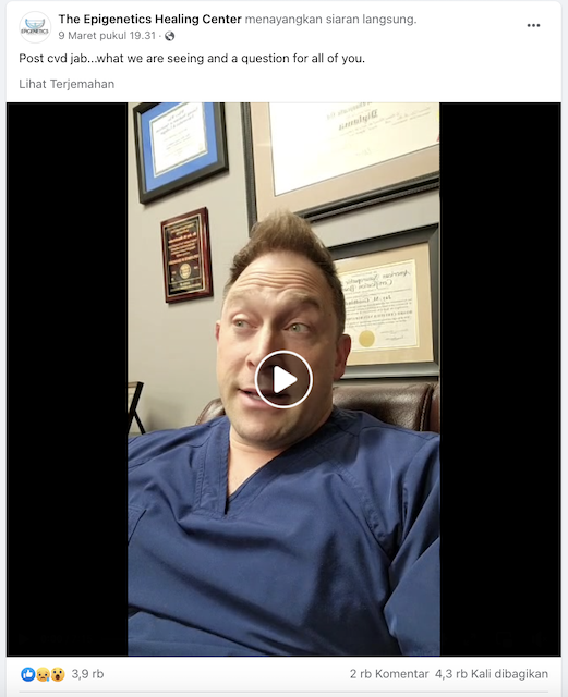Akun Facebook The Epigenetics Healing Center membagikan video tersebut pada Rabu, 9 Maret 2022. Pada video terlihat seorang pria berpakaian petugas kesehatan mengatakan bahwa orang yang memiliki kanker dan sembuh, akan kambuh jika menerima vaksin Covid-19.