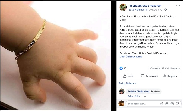 Informasi yang menyebut bahaya pemakaian emas pada bayi adalah salah. Informasi hoaks ini masuk dalam kategori False Context (konteks keliru). False context adalah sebuah konten yang disajikan dengan narasi dan konteks yang salah. Biasanya, false context memuat pernyataan, foto, atau video peristiwa yang pernah terjadi pada suatu tempat, namun secara konteks yang ditulis tidak sesuai dengan fakta yang ada.
