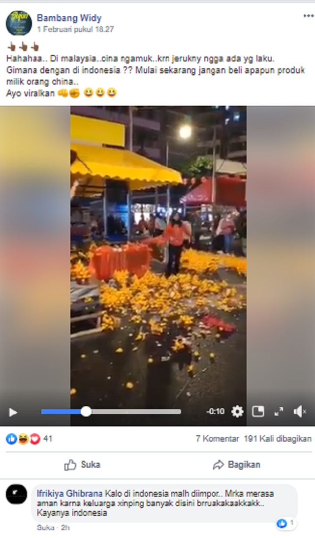 Adalah akun facebook Bambang Widy yang mengunggah video berdurasi 15 detik itu pada Sabtu 1 Februari 2020. Akun Bambang Widy mengatakan pria dan wanita itu merupakan warga Tiongkok yang sedang mengamuk di Malaysia karena barang dagangannya tidak laku.