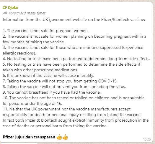Klaim peringatan bahaya penggunaan vaksin Pfizer / Biontech dari Pemerintah Inggris adalah salah. Faktanya, Pemerintah Inggris hanya mengeluarkan informasi saran untuk penerima vaksin Pzifer.