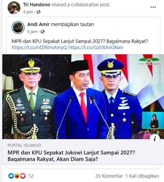 Akun Facebook atas nama Andi Amir mengunggah tautan artikel berita tersebut yang dimuat di situs berita Portal-Islam.id. Dalam unggahannya, ia memberikan narasi.