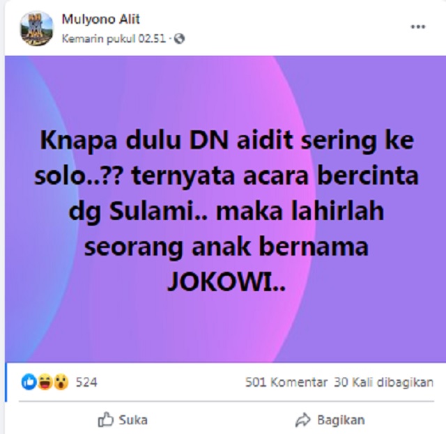 "Knapa dulu DN aidit sering ke solo..?? ternyata acara bercinta dg Sulami.. maka lahirlah seorang anak bernama JOKOWI..," tulis akun facebook Mulyono Alit.