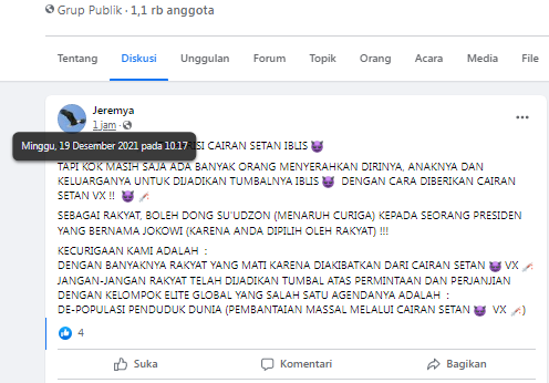 Adalah akun facebook Jeremya yang turut mengunggah narasi tersebut dalam grup penipuan Corona, Minggu 19 Desember 2021. Pada narasi itu dijelaskan vaksin merupakan diduga bagian dari agenda depopulasi atau pengurangan jumlah manusia di bumi.