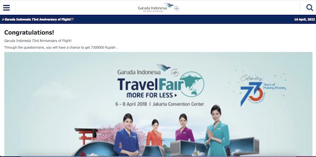 Jakarta, 15 April 2021 - Sehubungan dengan adanya informasi mengenai program survey berhadiah Garuda Indonesia melalui laman https://hqfttwm.cn/ele/tb.php?ct=id yang disebarluaskan melalui kanal social media anonim dan layanan pesan singkat WhatsApp oleh pihak-pihak tertentu, bersama ini Garuda Indonesia memastikan bahwa Perusahaan tidak pernah mengeluarkan informasi maupun aktivitas promo yang terdapat dalam situs tersebut.