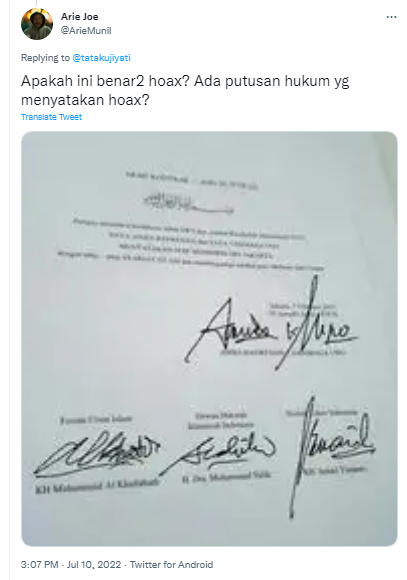 Adalah akun twitter @ArieMunil yang turut mengunggah foto dokumen tersebut, 10 Juli 2022. Akun itu mempertanyakan kebenaran dokumen tersebut.
