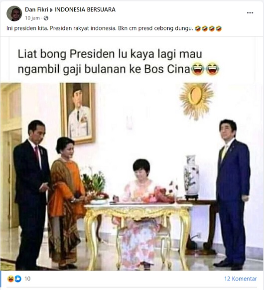 Dari hasil penelusuran tim cek fakta medcom.id, klaim foto Presiden Joko Widodo tengah mengambil gaji ke bos Tiongkok adalah salah. Faktanya, foto itu adalah momen ketika Presiden Joko Widodo menyambut kedatangan Perdana Menteri Jepang Shinzo Abe bersama istrinya Akie Abe di Istana Bogor pada 15 Januari 2017 lalu. Dari penelusuran kami, foto tersebut diunggah di situs resmi setkab.go.id. Kedatangan PM Jepang Shinzo Abe ke tanah air membicarakan kerjasama strategis di berbagai bidang terutama di bidang ekonomi, seperti perdagangan dan investasi.