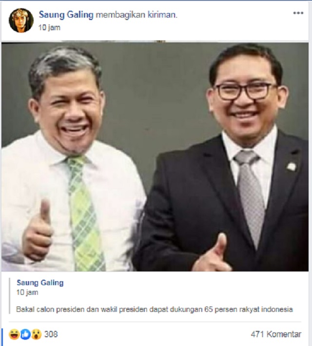 Beredar sebuah foto memperlihatkan foto mantan Wakil Ketua DPR Fahri Hamzah dan Fadli Zon di media sosial. Terhadap foto tersebut dinarasikan bahwa mereka mendapat dukungan sebanyak 65 persen rakyat Indonesia sebagai bakal calon Presiden dan Wakil Presiden.