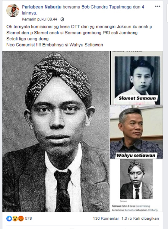 "Oh ternyata komisioner yg kena OTT dan yg menangin Jokoun itu anak p Slamet dan p Slamet anak si Semaun gembong PKI asli Jombang. Setali tiga uang dong
