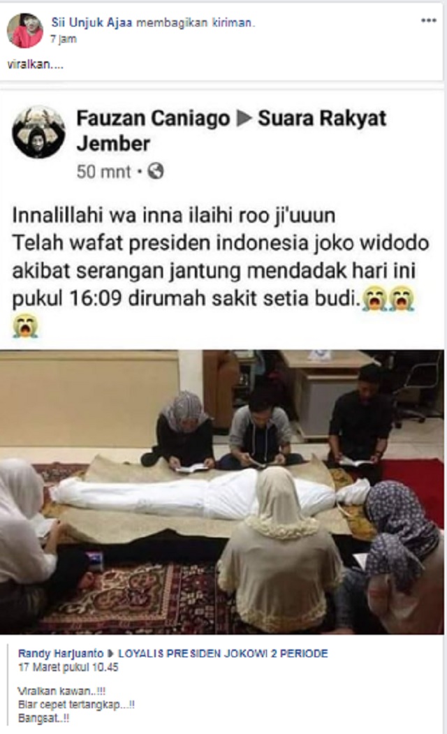 Akun facebook Sii Unjuk Ajaa kemudian membagikan unggahan akun Randy Harjuanto."Viralkan...," kata akun Sii Unjuk Ajaa, Rabu 18 Maret 2020.
