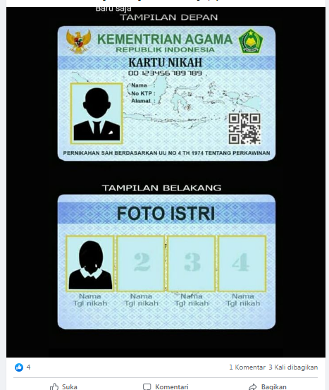Dari penelusuran kami, klaim bahwa Kementerian Agama menerbitkan kartu nikah dengan format 1 suami 4 istri, adalah salah. Faktanya, Kementerian Agama telah memberikan klarifikasi.