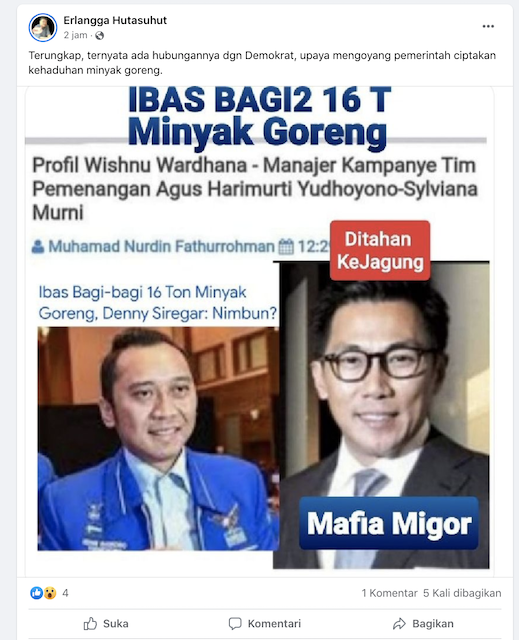 Adalah akun facebook Erlangga Hutasuhut yang turut mengunggah gambar dan narasi tersebut, Rabu 20 April 2022. Berikut penampakannya: