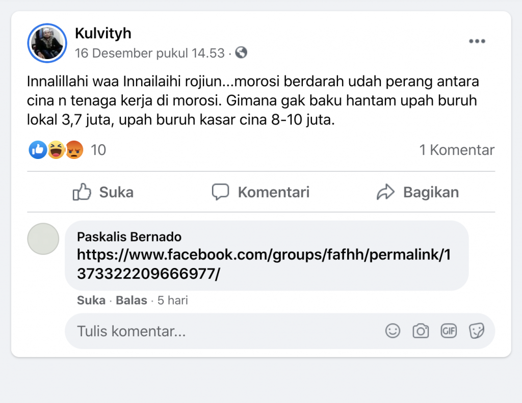 "Innalillahi waa Innailaihi rojiun...morosi berdarah udah perang antara cina n tenaga kerja di morosi. Gimana gak baku hantam upah buruh lokal 3,7 juta, upah buruh kasar cina 8-10 juta."