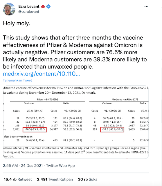 "Astaga. Studi ini menunjukkan bahwa setelah tiga bulan efektivitas vaksin Pfizer & Moderna terhadap Omicron sebenarnya negatif. Pelanggan Pfizer 76,5% lebih mungkin dan pelanggan Moderna 39,3% lebih mungkin terinfeksi daripada orang yang tidak divaksinasi. "