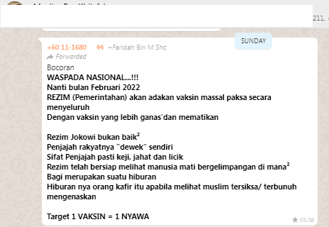 Beredar sebuah narasi bahwa rezim pemerintahan Presiden Joko Widodo (Jokowi) akan menggelar vaksinasi massal secara paksa pada Februari 2022 mendatang. Narasi ini beredar di WhatsApp, baru-baru ini.