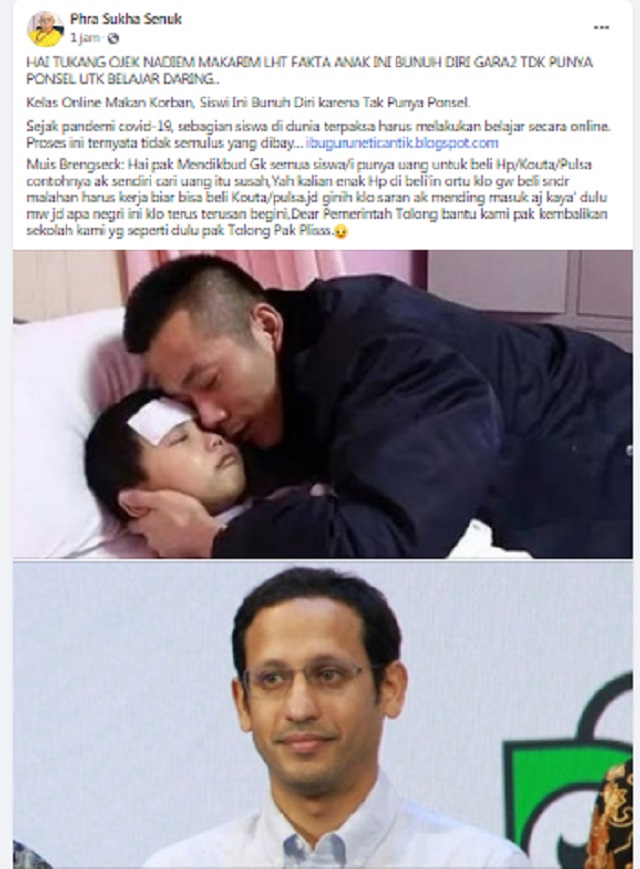 Adalah akun facebook Phra Sukha Senuk yang turut membagikan foto tersebut, Selasa 28 Juli 2020. Akun ini membuat narasi bahwa Menteri Pendidikan dan Kebudayaan (Mendikbud) Nadiem Makarim harus melihat fakta bahwa seorang anak tersebut menjadi korban kelas daring alias online.