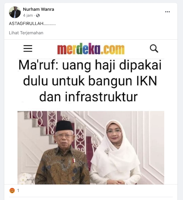 Akun Facebook Nurham Wanra ikut membagikan tangkapan layar tersebut pada Senin, 28 Maret 2022. Narasi pada judul "Ma'ruf: uang haji dipakai dulu untuk bangun IKN dan infrastruktur".