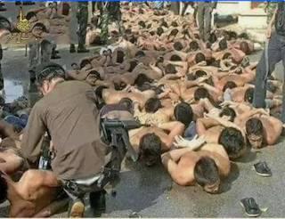 "THAILAND OUT Beberapa dari 300 demonstran yang ditangkap oleh polisi dan tentara berbaring di trotoar di kantor polisi Tak Bai di Narathiwat, Thailand, 25 Oktober 2004. Lusinan orang terluka dalam bentrokan antara pasukan keamanan Thailand dan ratusan pengunjuk rasa yang mencoba menyerbu sebuah kantor polisi di selatan Thailand yang mayoritas penduduknya bermasalah", kata para pejabat pada hari Senin.