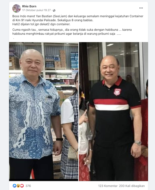"Boss Indo maret Yan Bastian (SeeLiam) dan keluarga semalam meninggal kejatuhan Container di Km 91 naik Hyundai Palisade. Sekaligus 8 orang bablas.