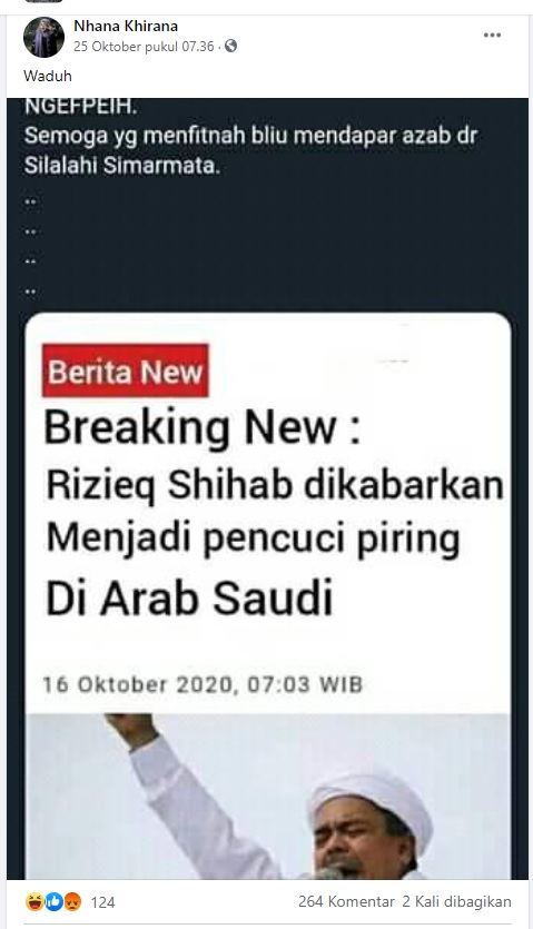 Akun Facebook atas nama Nhana Khirana membagikan tangkapan layar ini pada 25 Oktober 2020. Dalam unggahannya ia memberikan narasi sebagai berikut. "Waduh".