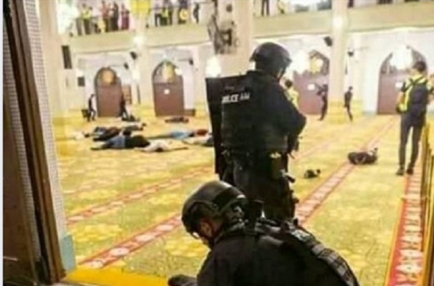 "Polisi kafir Singapore menggelar latihan penanggulangan terorisme di masjid dgn tetep memakai sepatu najiz di dalam karpet masjid....