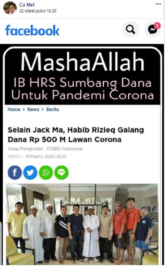 "Masha Allah, IB HRS Sumbang Dana Untuk Pandemi Corona," bunyi narasi yang terlihat pada foto tangkapan layar.