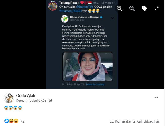 "Sehubungan dengan adanya pemberitaan di media sosial yang mengatasnamakan RS Jiwa Dr. Soeharto Heerdjan Jakarta tentang adanya pasien kabur atau melarikan diri, Kami Pihak RS Jiwa Dr. Soeharto Heerdjan mengklarifikasi bahwa BERITA TERSEBUT TIDAK BENAR/HOAX," tulis pihak RSJ dalam akun twitternya, @Humas_RSJSH, 30 April 2022.