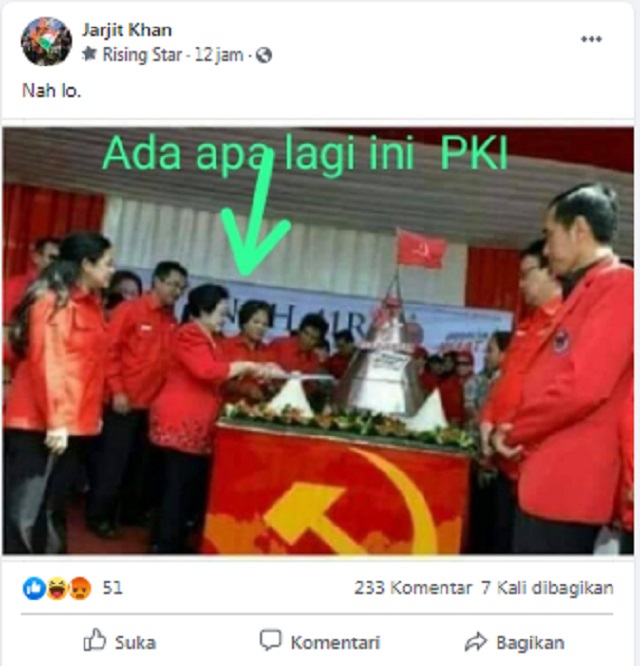 Adalah akun facebook Jarjit Khan yang turut mengunggah foto ini pada Jumat 29 Mei 2020. Dalam gambar itu seolah-olah PKI kembali muncul ke permukaan publik.