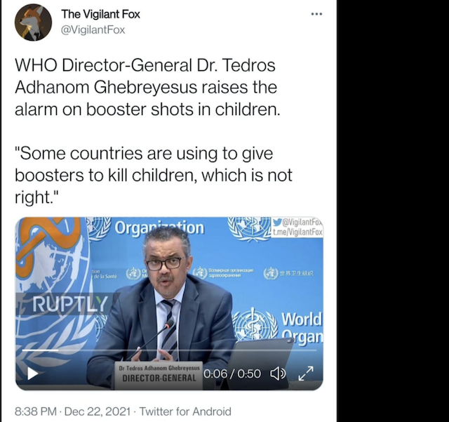 Klaim bahwa Kepala WHO, Tedros Adhanom Ghebreyesus memperingatkan beberapa negara dalam memberikan suntikan booster vaksin Covid-19 karena dapat membunuh anak-anak adalah salah. Faktanya, pernyataan Tedros disalahartikan.
