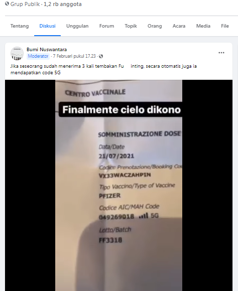 Dari penelusuran kami, klaim bahwa jika seseorang sudah divaksin booster atau tiga kali maka secara otomatis akan mendapatkan kode 5 G, adalah salah. Faktanya, tulisan 5G yang tampak pada surat semacam tanda sudah divaksin yang terlihat dalam video itu merupakan editan.